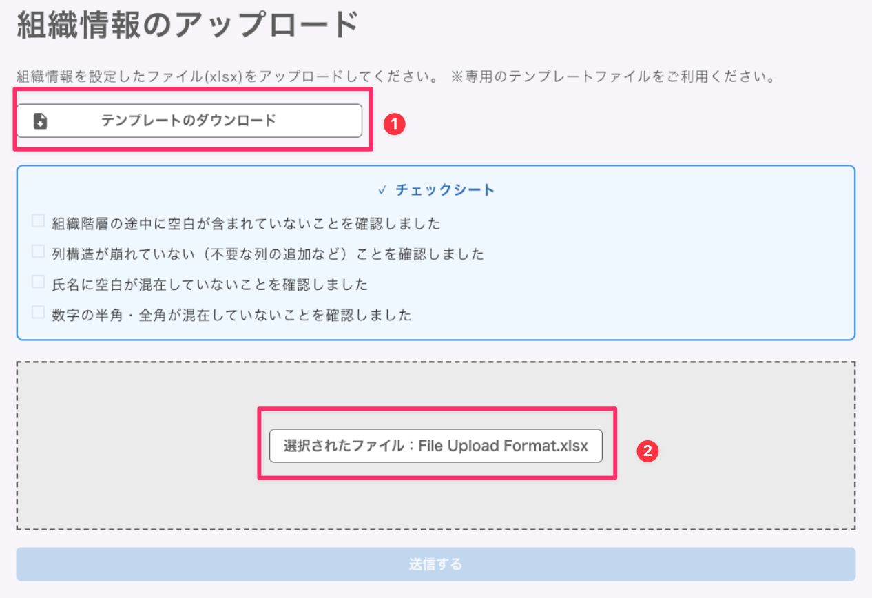 オンボーディング画面にて「①組織・従業員を登録」を押下いただくことで、組織情報のアップロード画面へ遷移します。