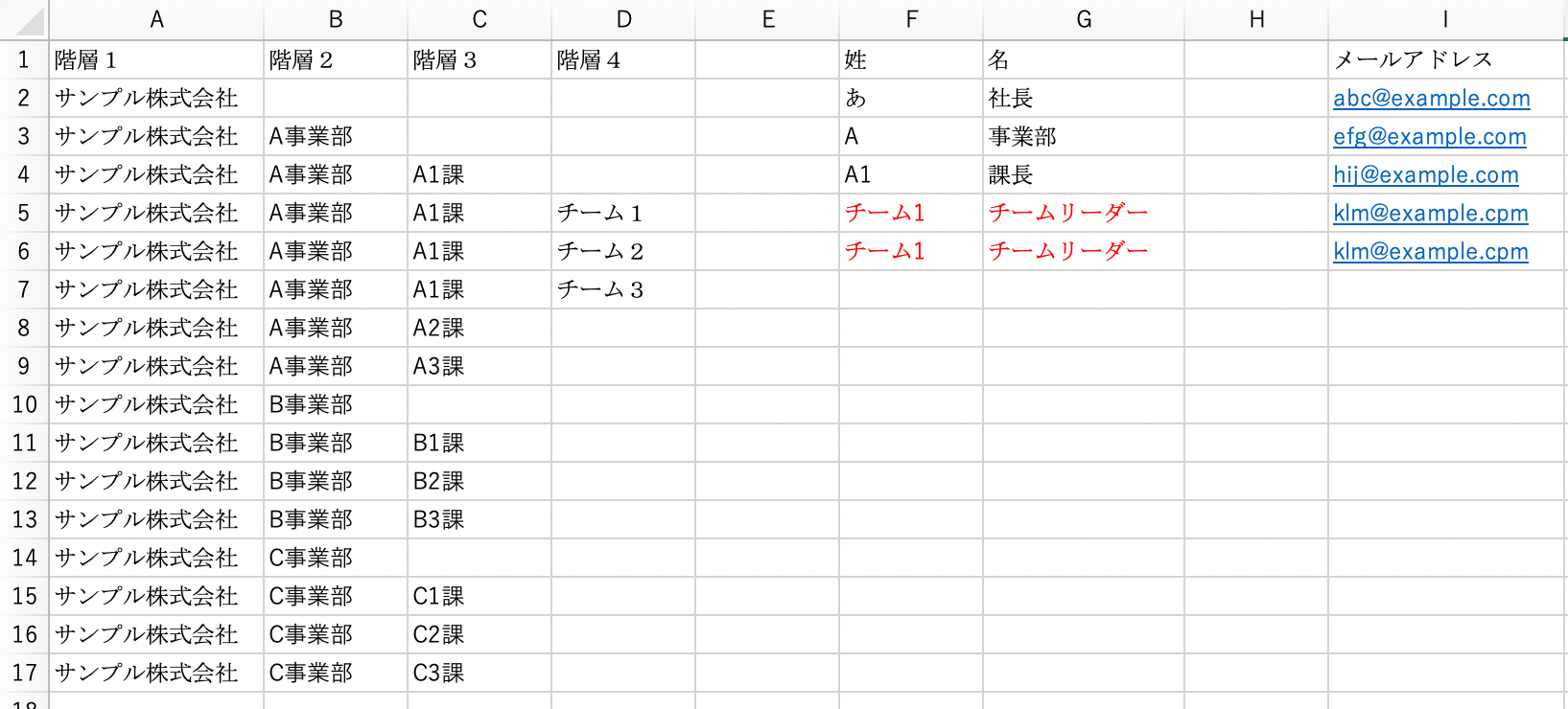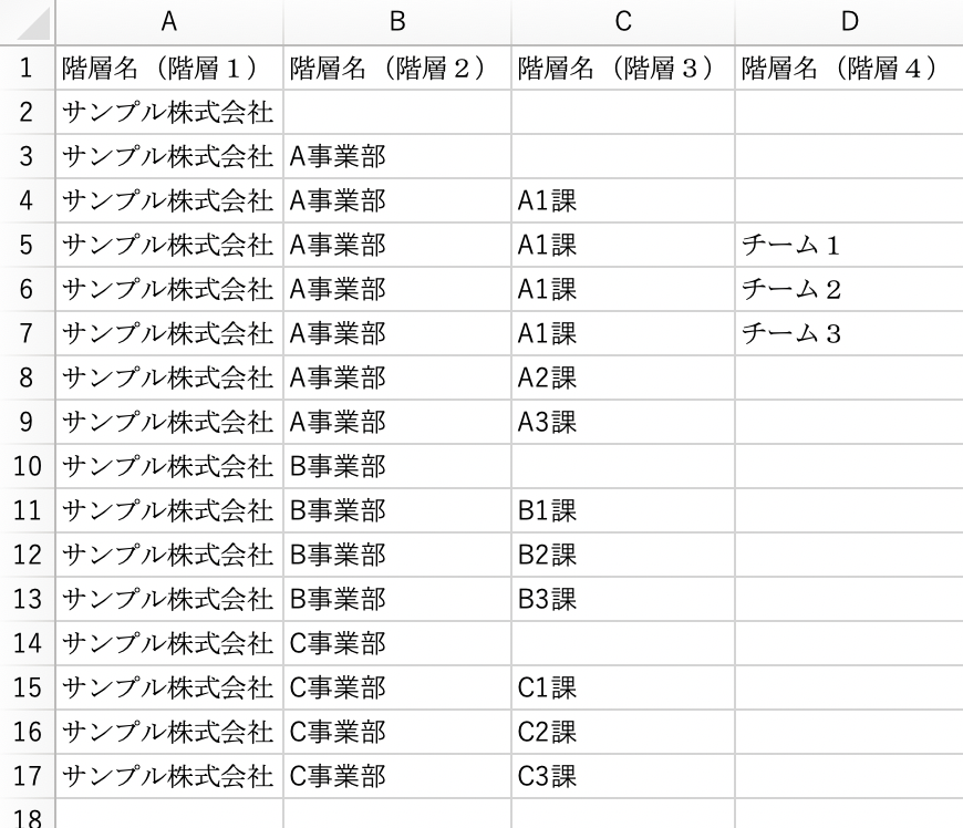 この階層の順番にexcelファイルに組織・チーム名をご記入ください(下記参照)。