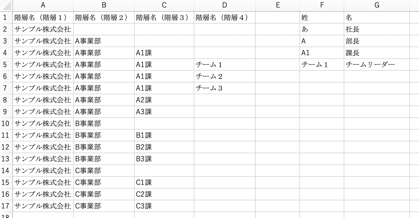 あ社長 については、excelファイル中のサンプル株式会社(階層1)の行に氏名をご記入ください。