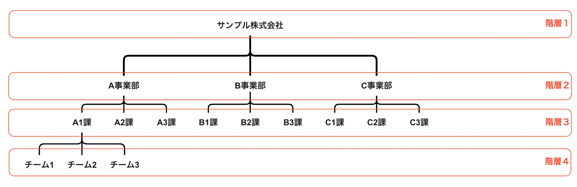 そして、階層の考え方ですが、ここでは、サンプル株式会社を階層1と考えます。
